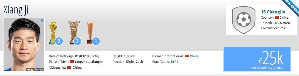 北京时间3月4日,德转更新,36岁后卫吉翔自由身加盟“新江苏队”江苏常晋,据悉球队今年将参加中冠。
